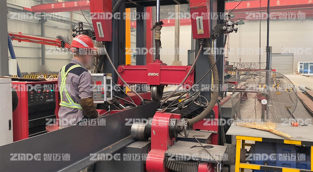 2023年,該鋼構廠與智邁德達成合作,引進一臺裝配式H/T型建筑鋼梁組焊矯一體機。該設備組立、焊接、矯正“三位一體”,一臺設備替代傳統(tǒng)組立機、龍門焊、矯正機三臺設備,僅需1~2人即可操作,降低了人力成本,提高了生產(chǎn)效率。腹板18mm以下免坡口焊接,自動對中,無需點焊,熱焊熱矯,從頭焊到尾,滿足了生產(chǎn)需求,提升了產(chǎn)品品質(zhì)。